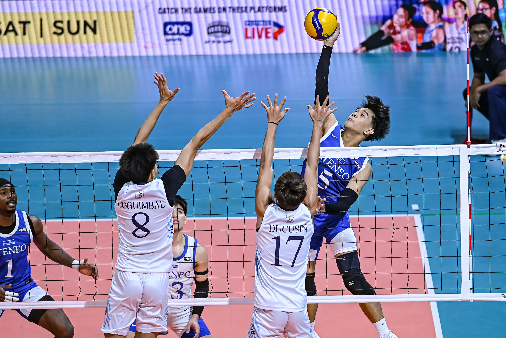 Coguimbal led the Soaring Falcons with 15 points on nine blocks, five attacks, and one ace—the most blocks in UAAP men’s volleyball since teammate Richard Besorio recorded nine in a five-set loss to University of the East on February 21—while Tan contributed 14 points and three excellent digs.