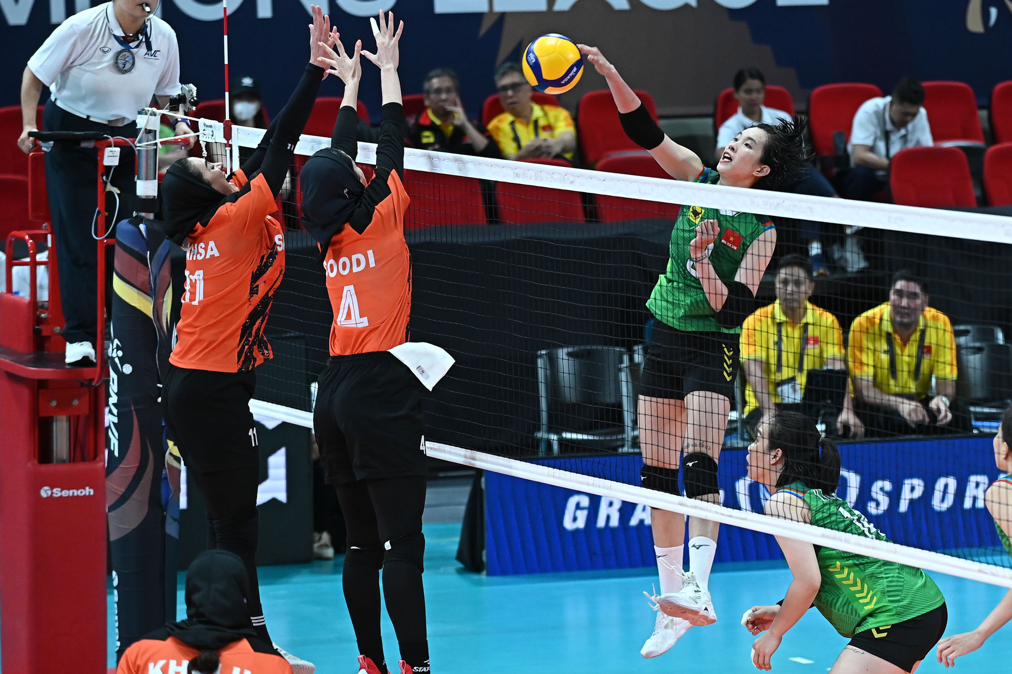 The Vietnamese champions cruised through the second set, but had to dig deep in the third and fourth to fend off the determined Iranian squad. In the third frame, Tran Thi Thanh Thuy delivered three consecutive hits to break a 21-20 deadlock and bring her team to set point at 24-20.