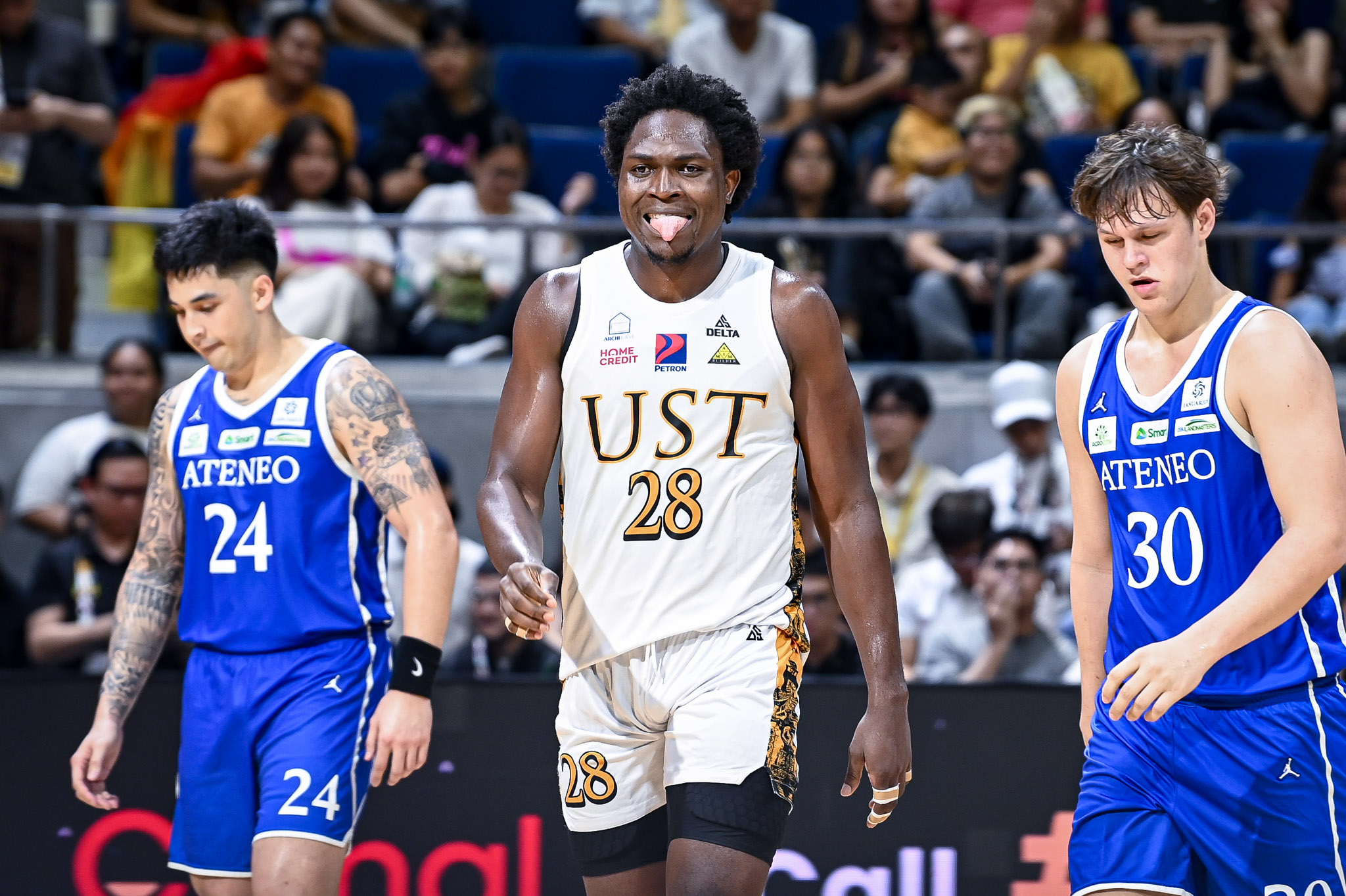Kymani Ladi opened the fourth with a three-pointer to cut the Blue Eagles’ deficit to four, 49-53, but Forthsky Padrigao fired two triples to push UST ahead 59-49.