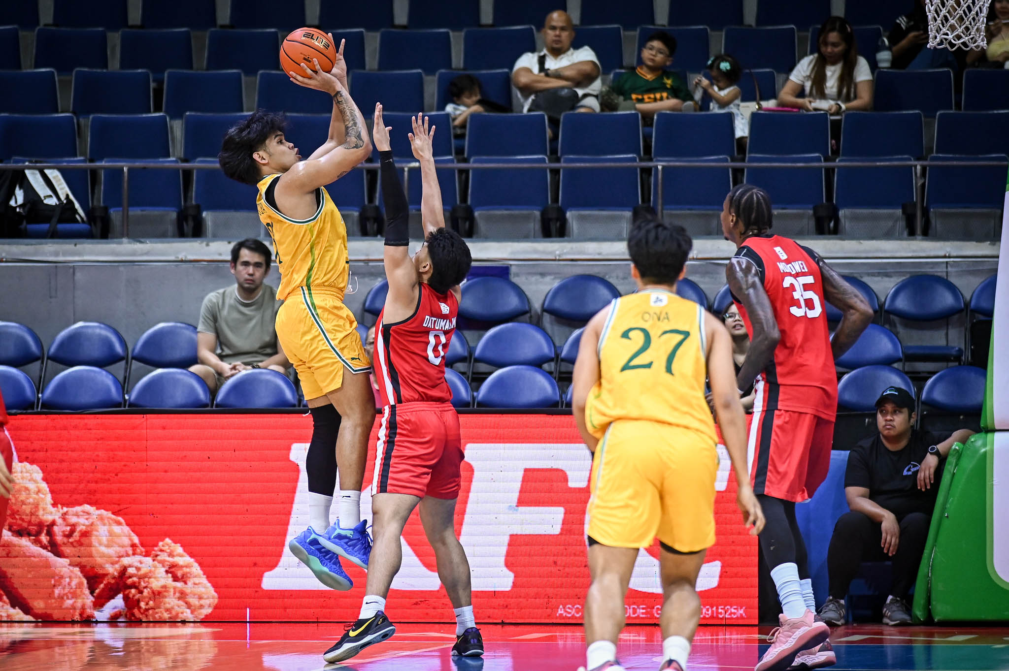 UE forced a stop on the other end, sending FEU to a shot-clock violation with 16 seconds remaining. However, Dray Caoile airballed his three-point attempt, and Jorick Bautista iced the game from the free throw line.
