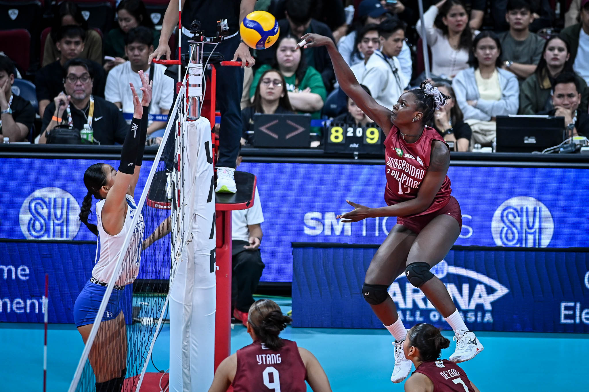 The 6-foot Nigerian opposite spiker delivered six points in the third set alone, helping the Fighting Maroons fight back and extend the match, 22-25.